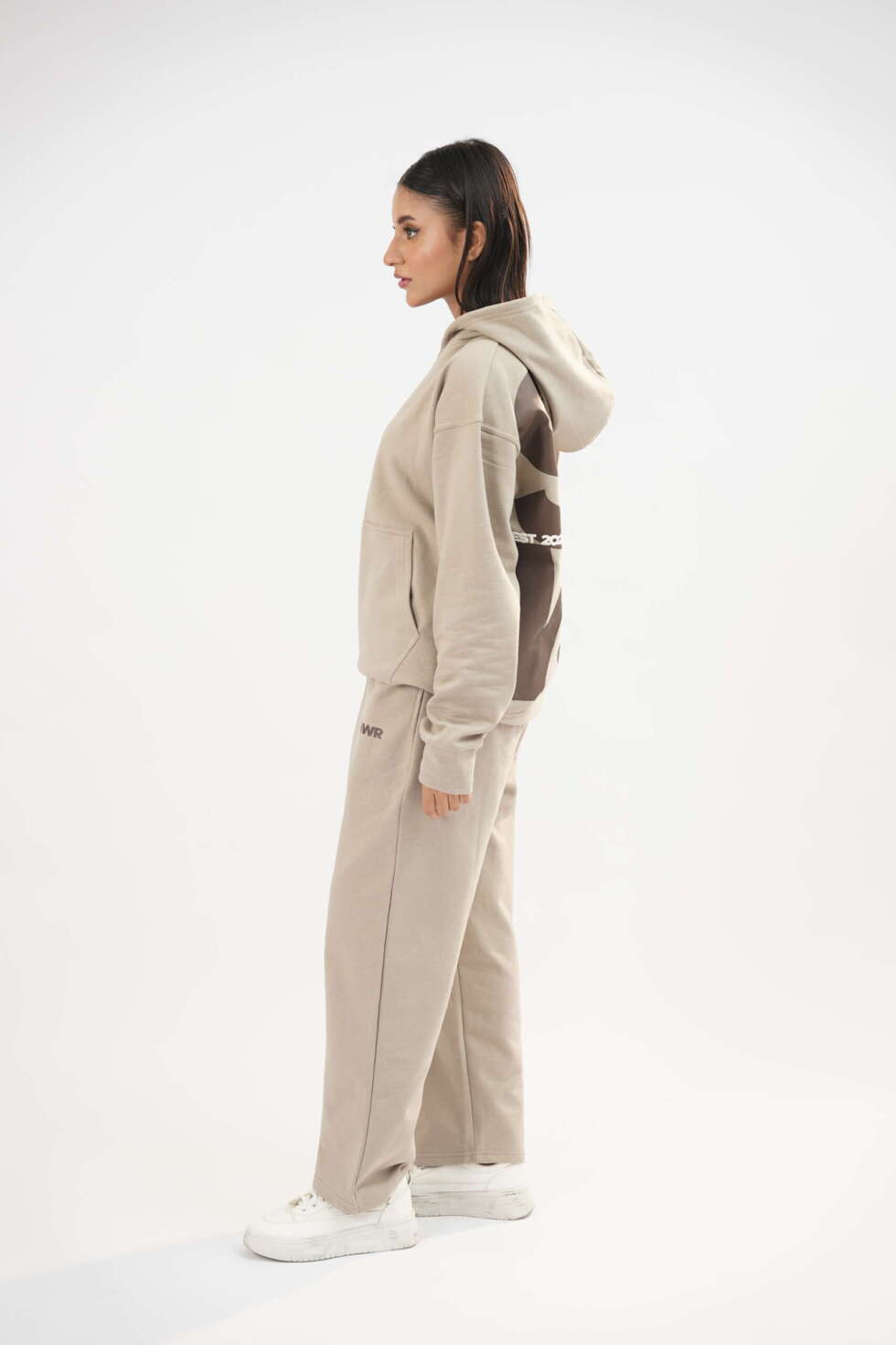 Beige unisex oversized hoodie and trouser co-ord with subtle SMWR branding. Heavyweight fleece, relaxed fit, everyday comfort.