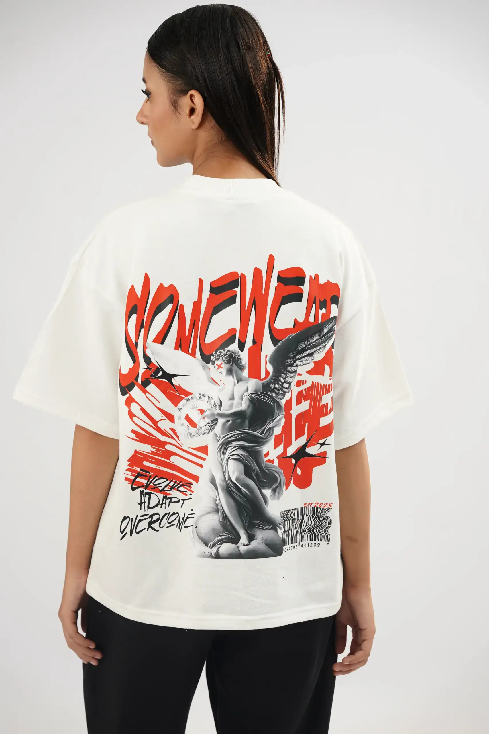 - Graphic: Extra-large back print with layered typography and statue artwork