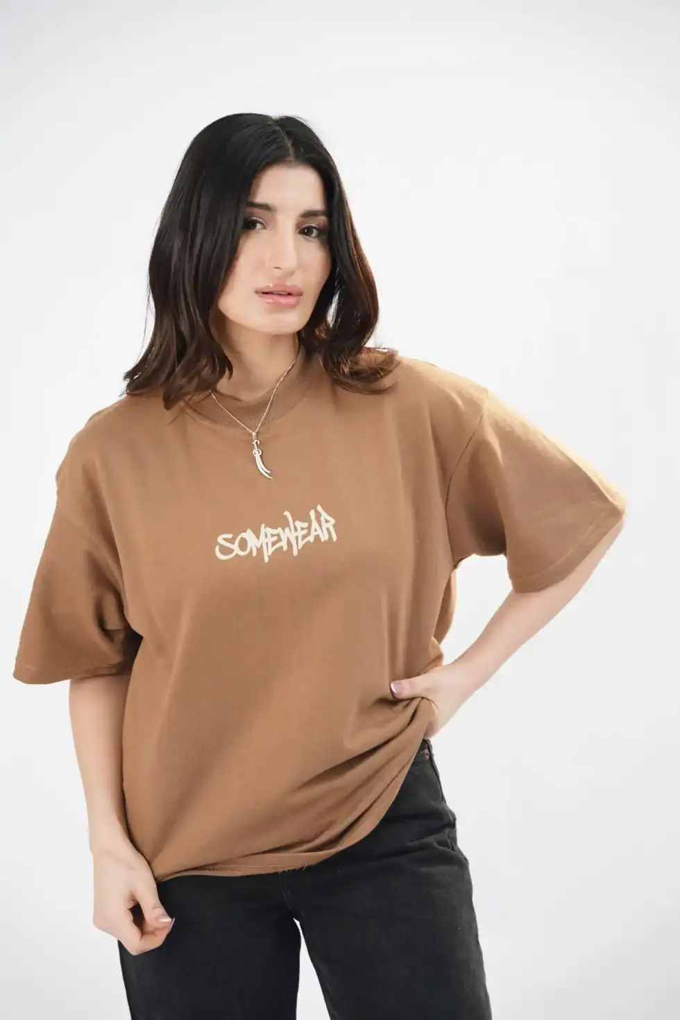 Mocha oversized tee with graffiti frame, flame crown, and cupid artwork across the back. Clean front, relaxed fit, high-definition print.